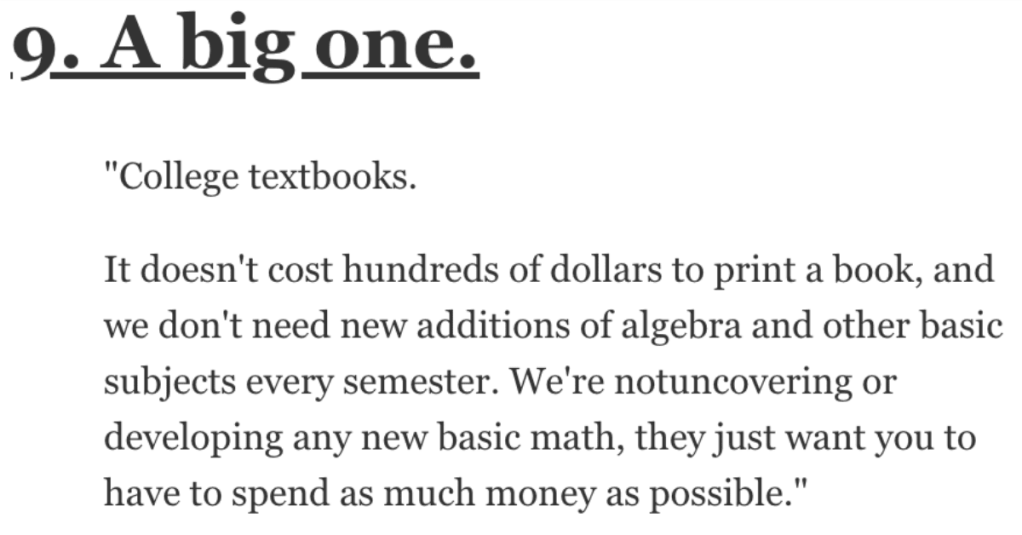 It doesn’t cost hundreds of dollars to print a book, and we don’t need new additions of algebra and other basic subjects every semester.