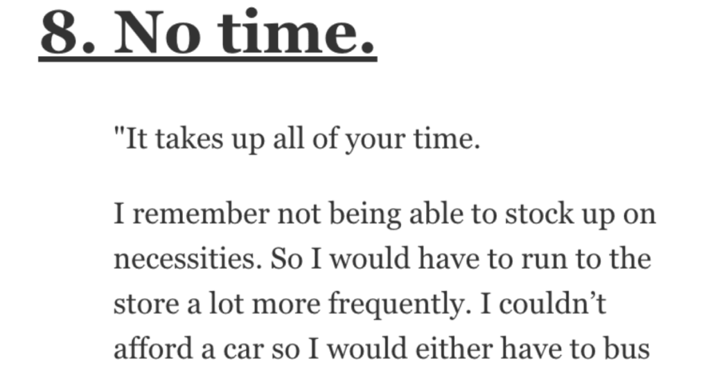 I remember not being able to stock up on necessities. So I would have to run to the store a lot more frequently. I couldn’t afford a car so I would either have to bus or walk.