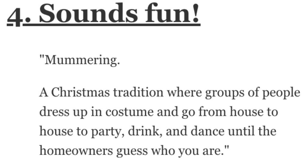 A Christmas tradition where groups of people dress up in costume and go from house to house to party, drink, and dance until the homeowners guess who you are.