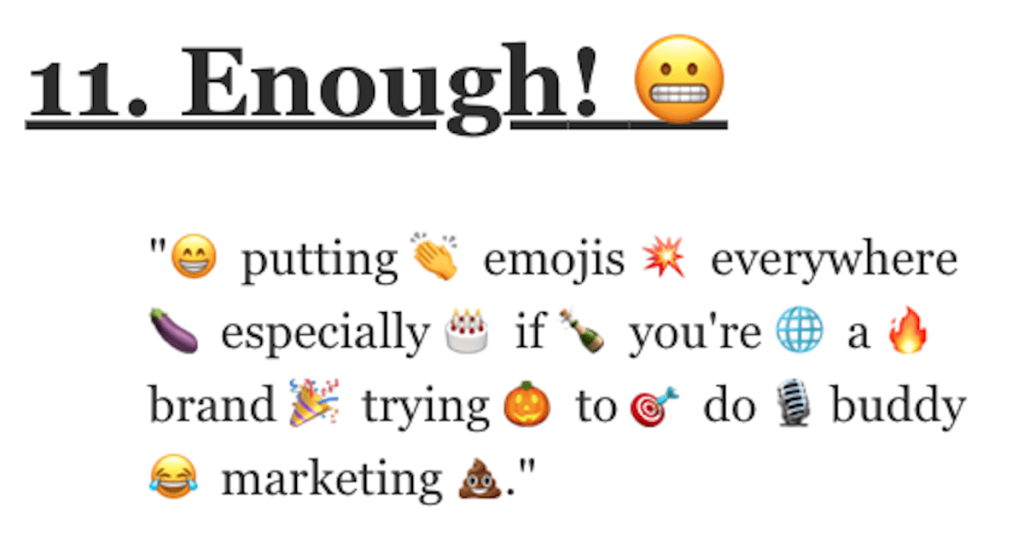 “😁  putting 👏  emojis 💥  everywhere 🍆  especially 🎂  if 🍾  you’re 🌐  a 🔥  brand 🎉  trying 🎃  to 🎯  do 🎙 buddy 😂  marketing 💩.”
