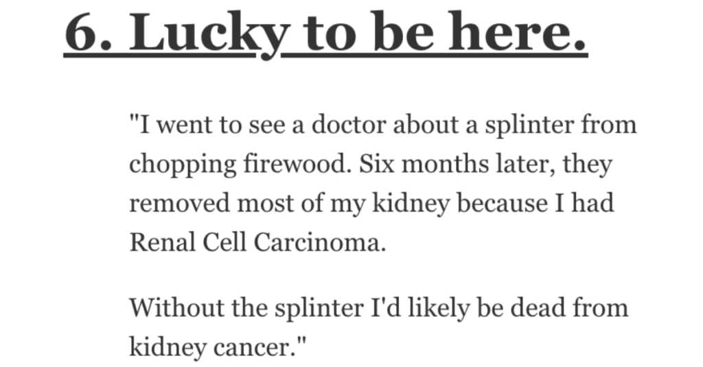 Aside from that, without recounting all the details; I went to see a doctor about a splinter from chopping firewood, 6 months later they removed most of my kidney with Renal Cell Carcinoma.