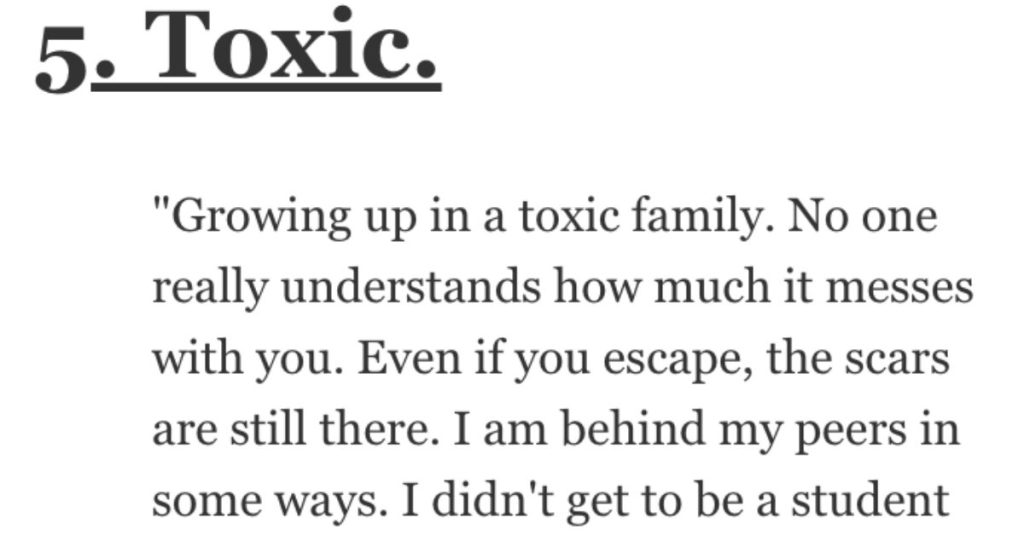 No one really understands how much it messes with you. Even if you escape, the scars are still there. I am behind my peers in some ways. I didn’t get to be a student and enjoy those years like everyone else. I spent my early 20s trying to overcome trauma alone. Mid 20s I finally figured out how to make friends and keep them.