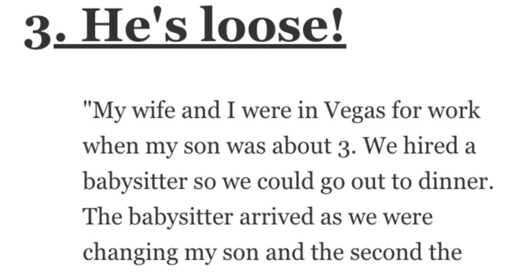 We hired a babysitter so we could go out to dinner. The babysitter arrived as we were changing my son and the second the hotel room door opened he sprinted. It caught the sitter off guard and my son got a good head start.