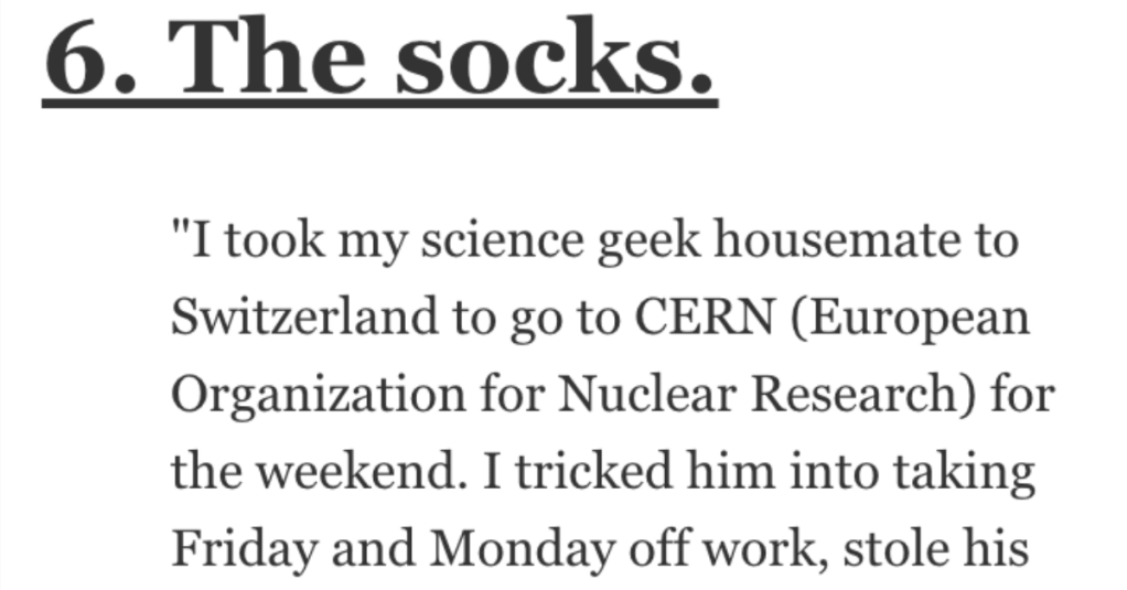 “I took my science geek housemate to Switzerland to go to CERN (European Organization for Nuclear Research) for the weekend.