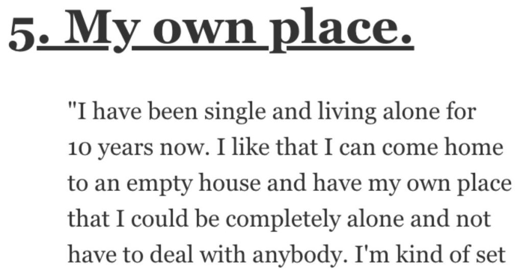 I like that I can come home to an empty house and have my own place that I could be completely alone and not have to deal with anybody.