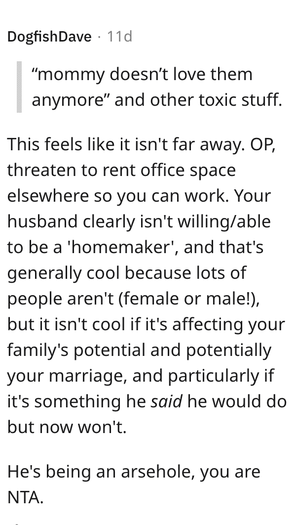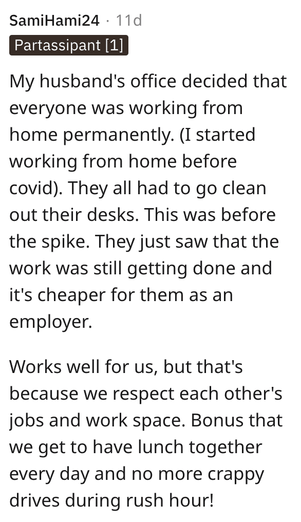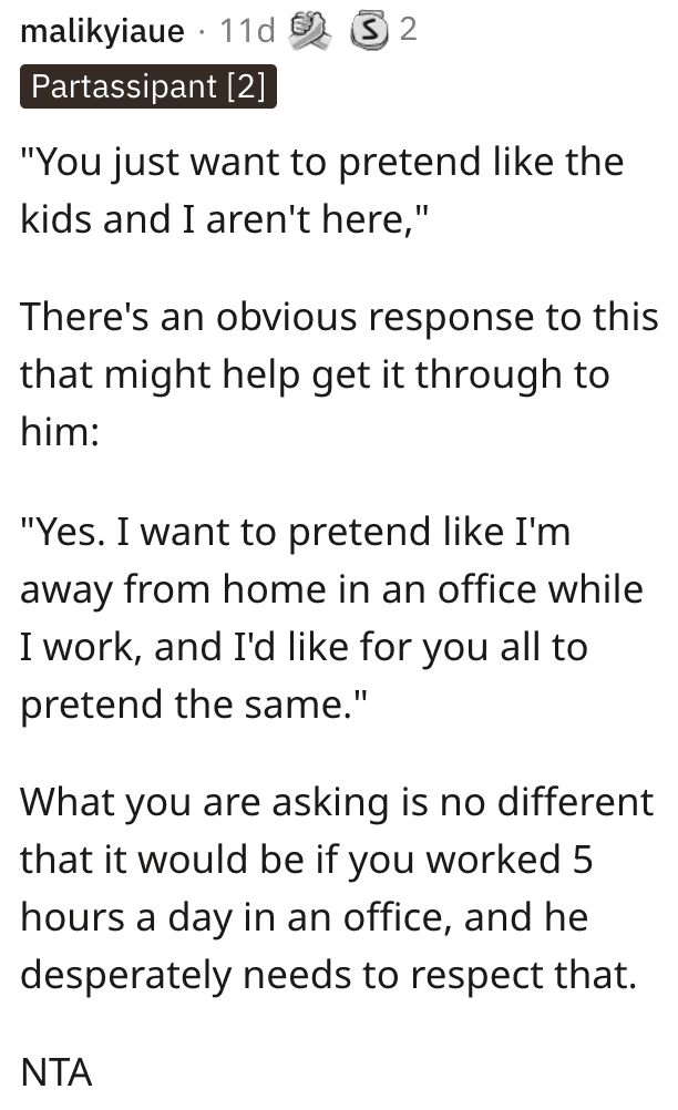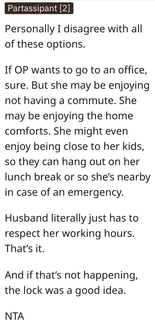 There was this suggestion, that she ask him to pretend she’s in an office away from home, not an office in the home.