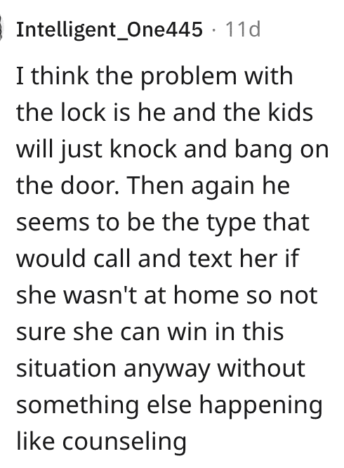 She went and bought a lock, and when he saw that she’d installed it, said how hurt he was and how he didn’t understand how she could just act like they weren’t there all day.