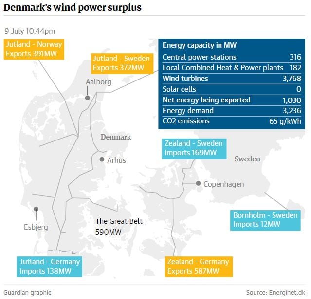- Denmark makes Germany look like amate*rs when it comes to renewable energy. On a windy day, they can produce up to 140% of their national energy needs from wind turbines.