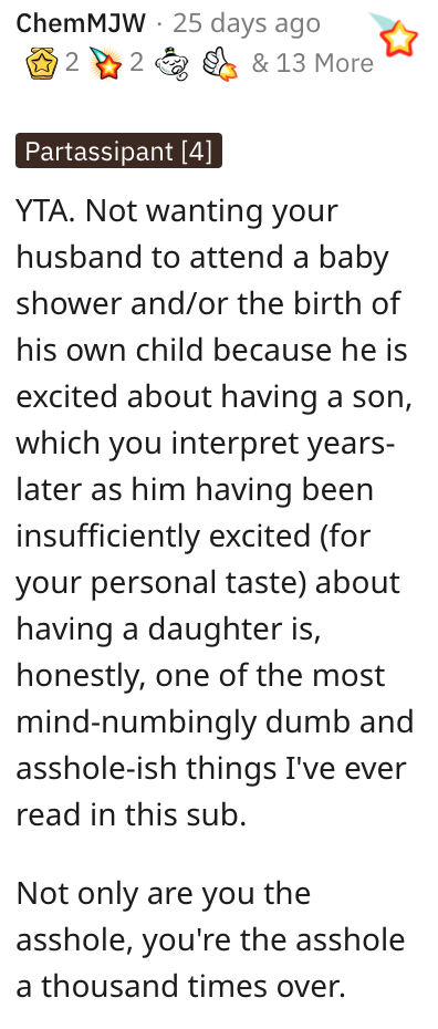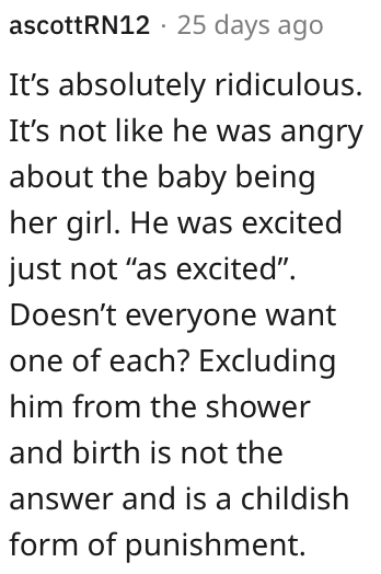 I confronted him about not being this excited about having girls, and he said “cause I wanted a boy ”. I got so p**sed off, I don’t want him at the baby shower (I guess it’s not really a baby shower as we’re not asking for anything, but still) or the birth.