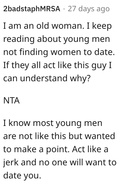 And this Reddit user said she can understand why young men can’t find women to date if they act like this.