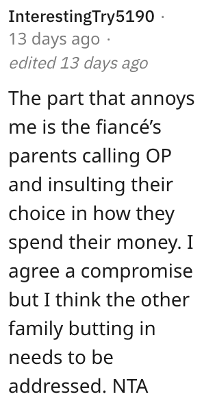 And this individual said she’s NTA and that the fiancée’s family needs to stay out of it.