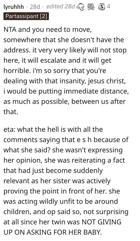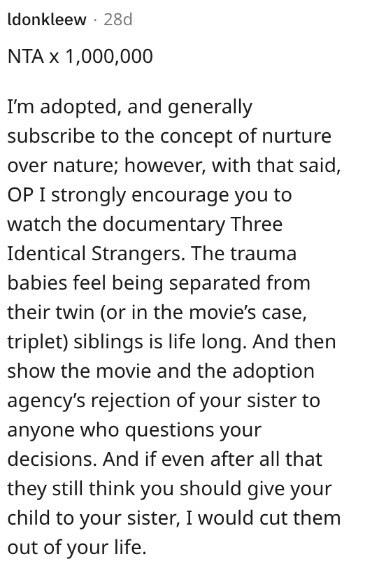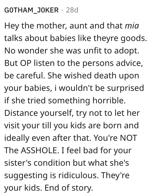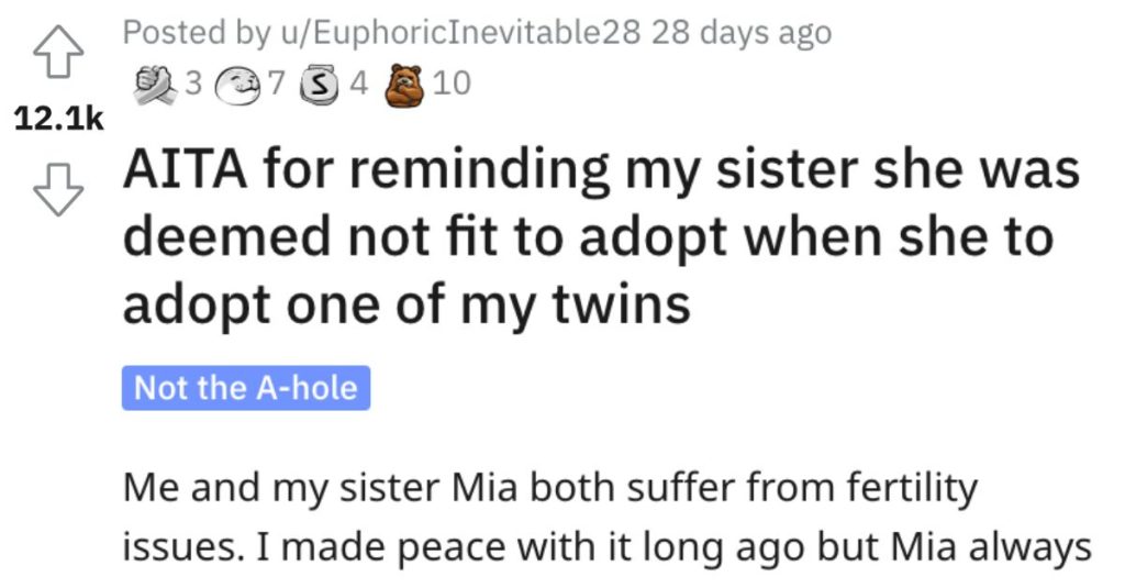 AITA for reminding my sister she was deemed not fit to adopt when she to adopt one of my twins?