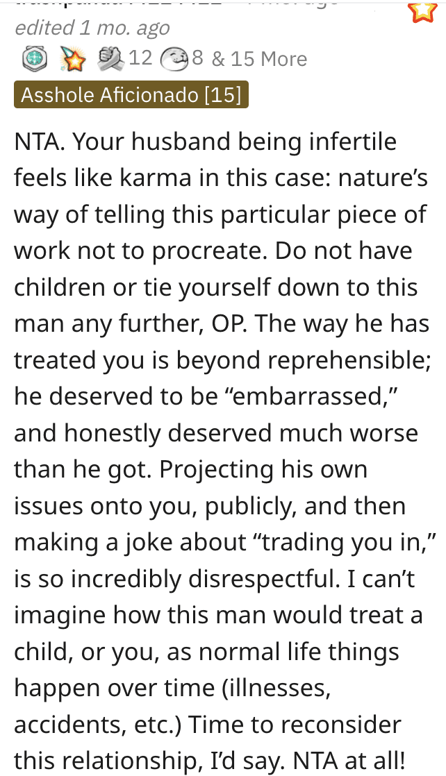 This couple always assumed they would have children, but after trying for awhile without success, they went to a doctor and learned OP’s husband is infertile.