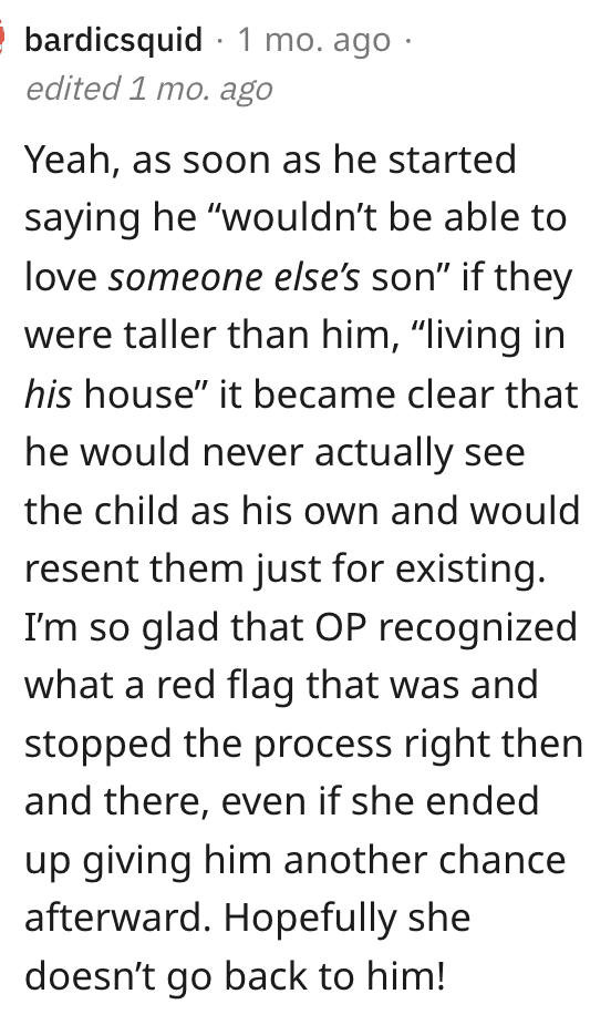 He demanded to see some samples of sperm from shorter men, because “it’s a man thing” and he apparently wouldn’t be able to love “someone else’s son” that’s taller than him, living in “his” house. I stopped the appointment, and we got into a terrible fight on the way home.