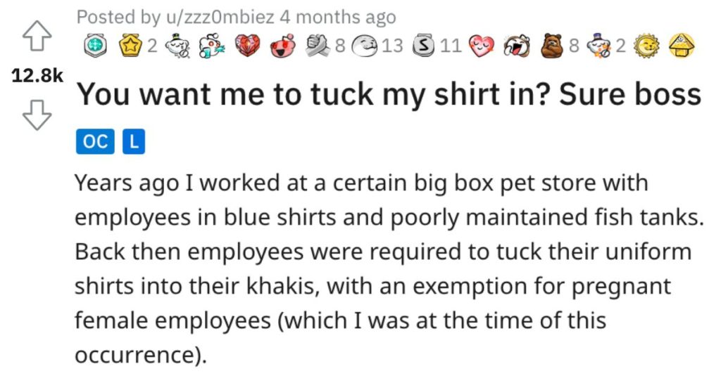 Back then employees were required to tuck their uniform shirts into their khakis, with an exemption for pregnant female employees (which I was at the time of this occurrence).