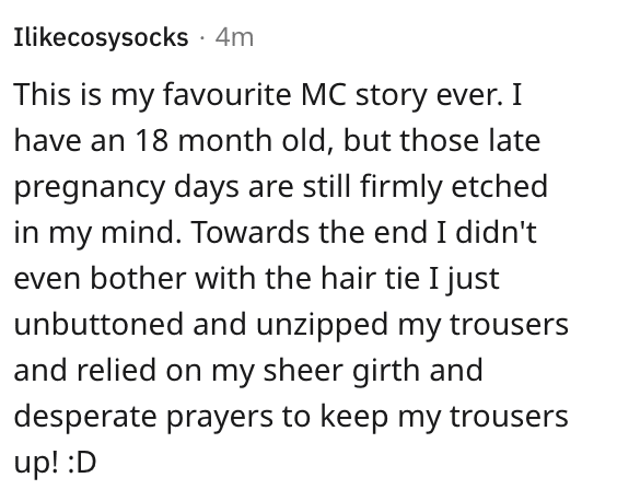 This gives you a few extra inches of waist room in your pants to accommodate the baby bump (and also exposing your underwear/ lower abdomen since you cannot zip your fly). Both options look absolutely ridiculous and are meant to be concealed under a shirt, and they only get more ridiculous the more pregnant you are (which we were both HEAVILY pregnant by this time).