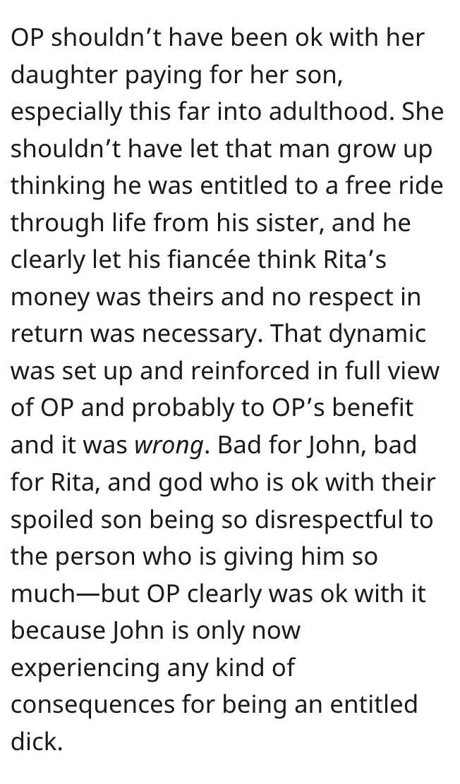 Now John and Sam are yelling at me saying that I’ve spoiled her and made her into an egoistic loser but Rita’s already given them an engagement and a wedding gift (apart from the funding) so I told them that she’s done her part and that childhood friend could cover the expenses.